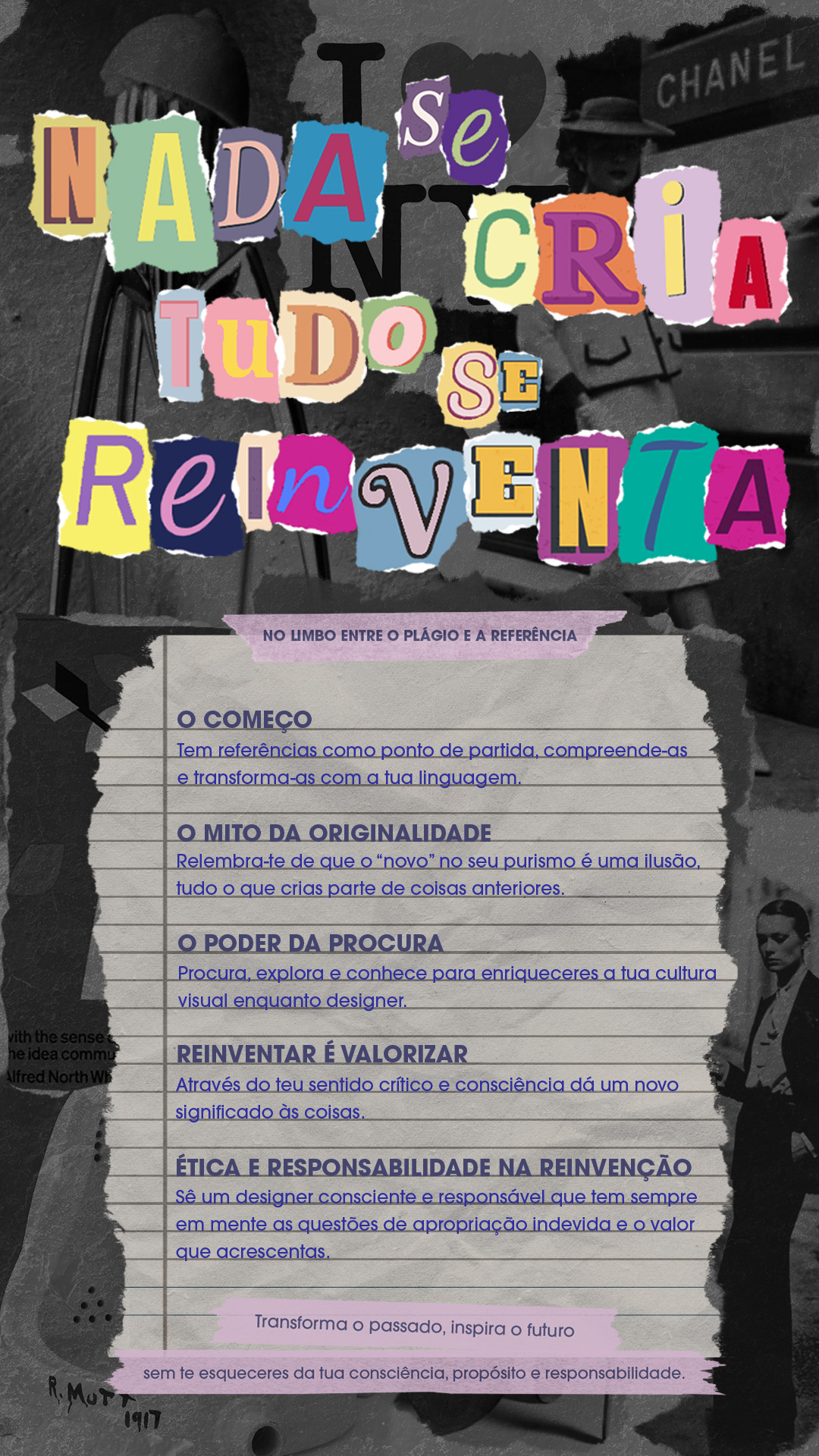 O poder do designer não está em inventar algo novo, mas dar-lhe um novo significado. Transformar coisas banais em relevantes é um ato de afirmação, pois copiar é fácil, mas reinventar é ser criativo. É saber olhar para aquilo que existe e vê-lo de forma diferente, com sentido crítico e consciência.