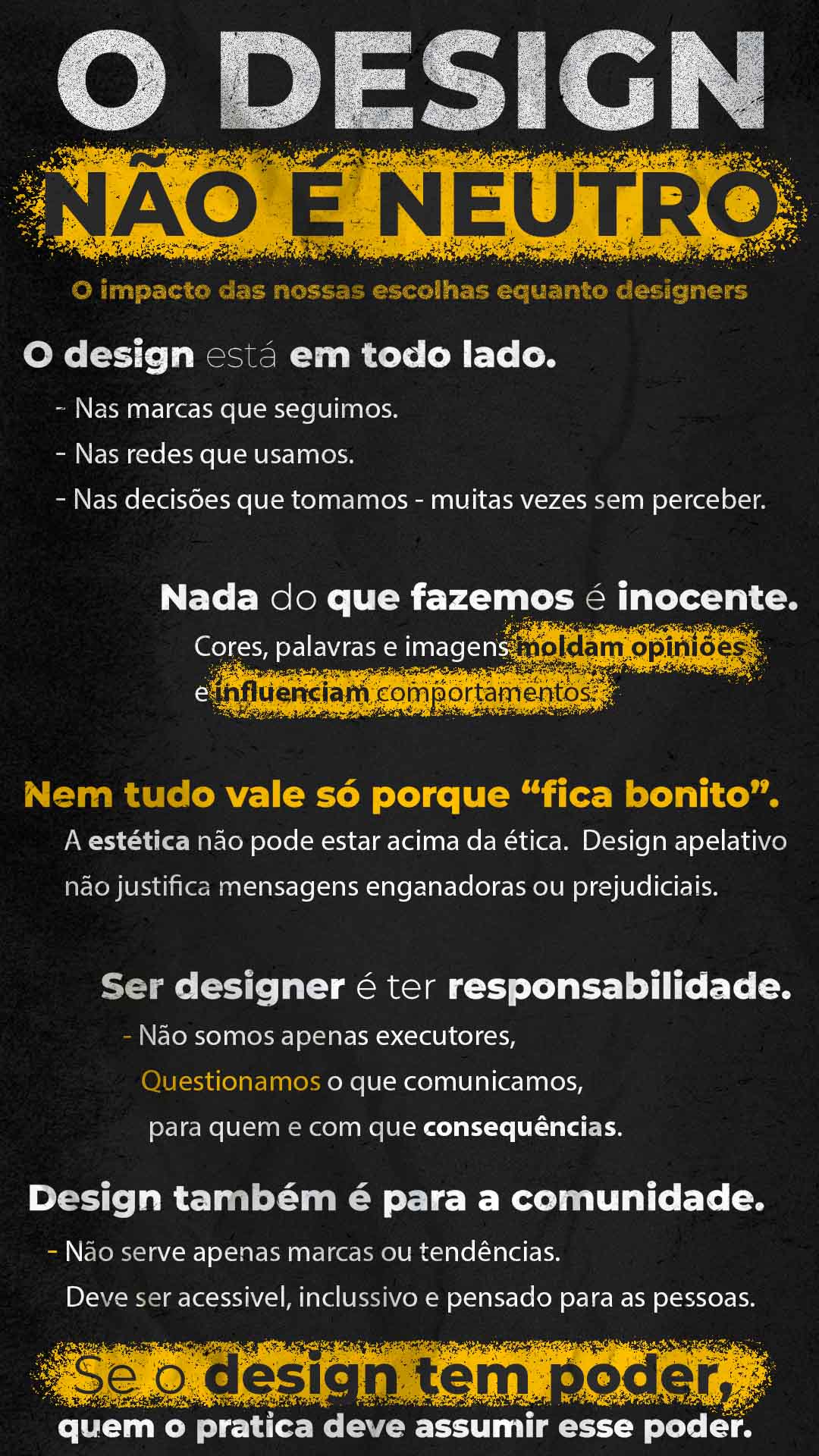 Nada do que fazemos é inocente. Cores, palavras e imagens moldam opiniões e comportamentos. O design tem impacto, quer queiramos ou não. Cada escolha visual carrega uma intenção e influencia a forma como a mensagem é percebida, mesmo quando isso não é imediatamente evidente. Ignorar esse poder é também uma forma de escolha.