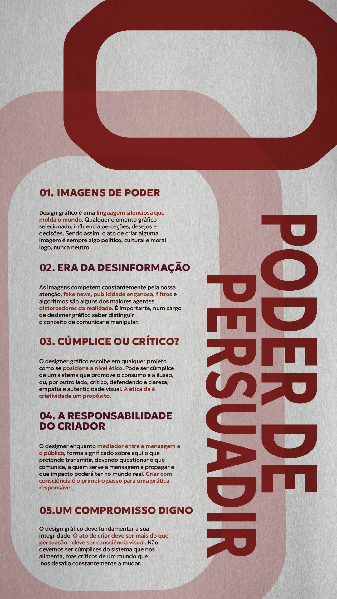O design gráfico deve fundamentar a sua integridade. O ato de criar deve ser mais do que persuasão – deve ser consciência visual. Não devemos ser cúmplices do sistema que nos alimenta, mas críticos de um mundo que nos desafia constantemente a mudar.