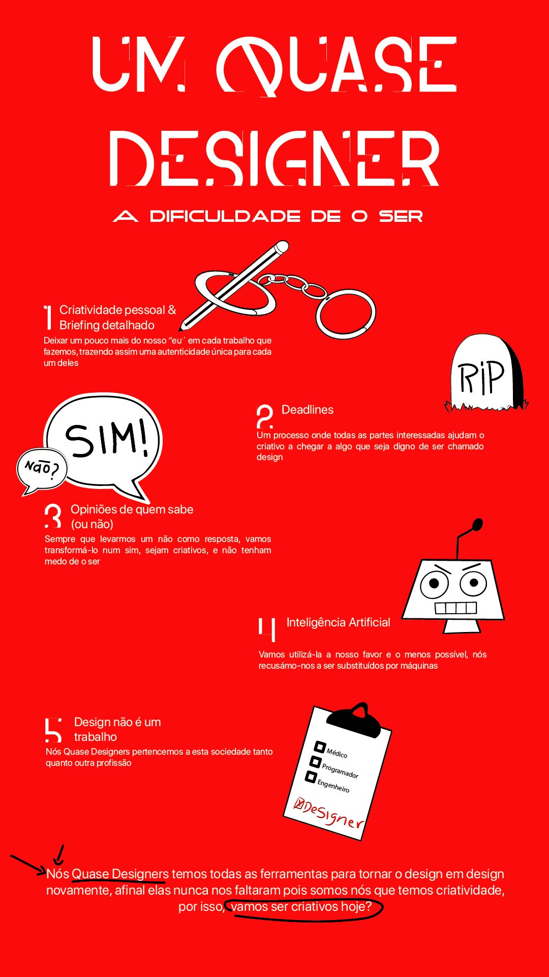 Se design não fosse um trabalho não existiria nada no mundo, tudo advém deste, pessoas desinformadas que nos dizem “estudas design! Queres ficar desempregado?” um bando de hipócritas que falam do nosso trabalho enquanto utilizam roupas feitas por designers, têm telemóveis desenhados por designers, sentam-se em cadeiras desenhadas por designers o texto poderia ser infinito, mas com isto conseguimos entender o quão desinformadas as pessoas estão sobre o nosso trabalho, vamos começar a educar estas sobre o realmente significa ser designer e criativo, mostrando então que nós Quase Designers pertencemos a esta sociedade tanto quanto outra profissão.